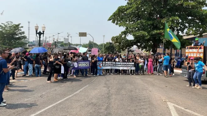 O Sindicato dos Servidores da Saúde do Acre (Sintesac) e o Conselho Regional de Enfermagem (Coren) puxaram agora há pouco um movimento no centro de Rio Branco, em protesto a decisão do STF de suspender o piso concedido a categoria pelo presidente Jair Bolsonaro (PL). O ato foi pacífico.