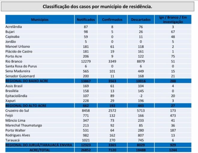 Jordão, Santa Rosa do Purus, Acrelândia e Brasiléia com 13 notificações confirmada