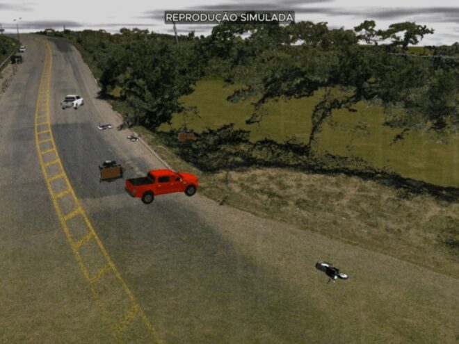 A simulação mostra o carro de Talysson Duarte descendo a ladeira na Via Verde e as três motocicletas, duas delas com reboque, no sentido contrário. Em certo momento, a caminhonete de Talysson gira na pista e sai desgovernada derrapando na estrada.
