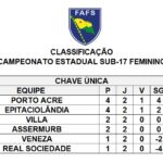 Já no feminino, o Epitáciolândia EC também teve bom desempenho, superando o time do Veneza por 4 a 2, em uma partida equilibrada. Com o resultado, as meninas do Alto Acre assumem a vice-liderança do Campeonato Estadual Sub-17 Feminino de Futsal.