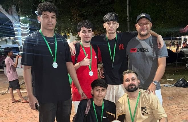 Os jogadores Yan Braga, Victor Hugo, Fabrício Luiz e Thailon Daniel, acompanhados do vice-prefeito Sérgio Mesquita e do CEO da VPS Ricardo Maffi, deram um show de talento e jogabilidade.