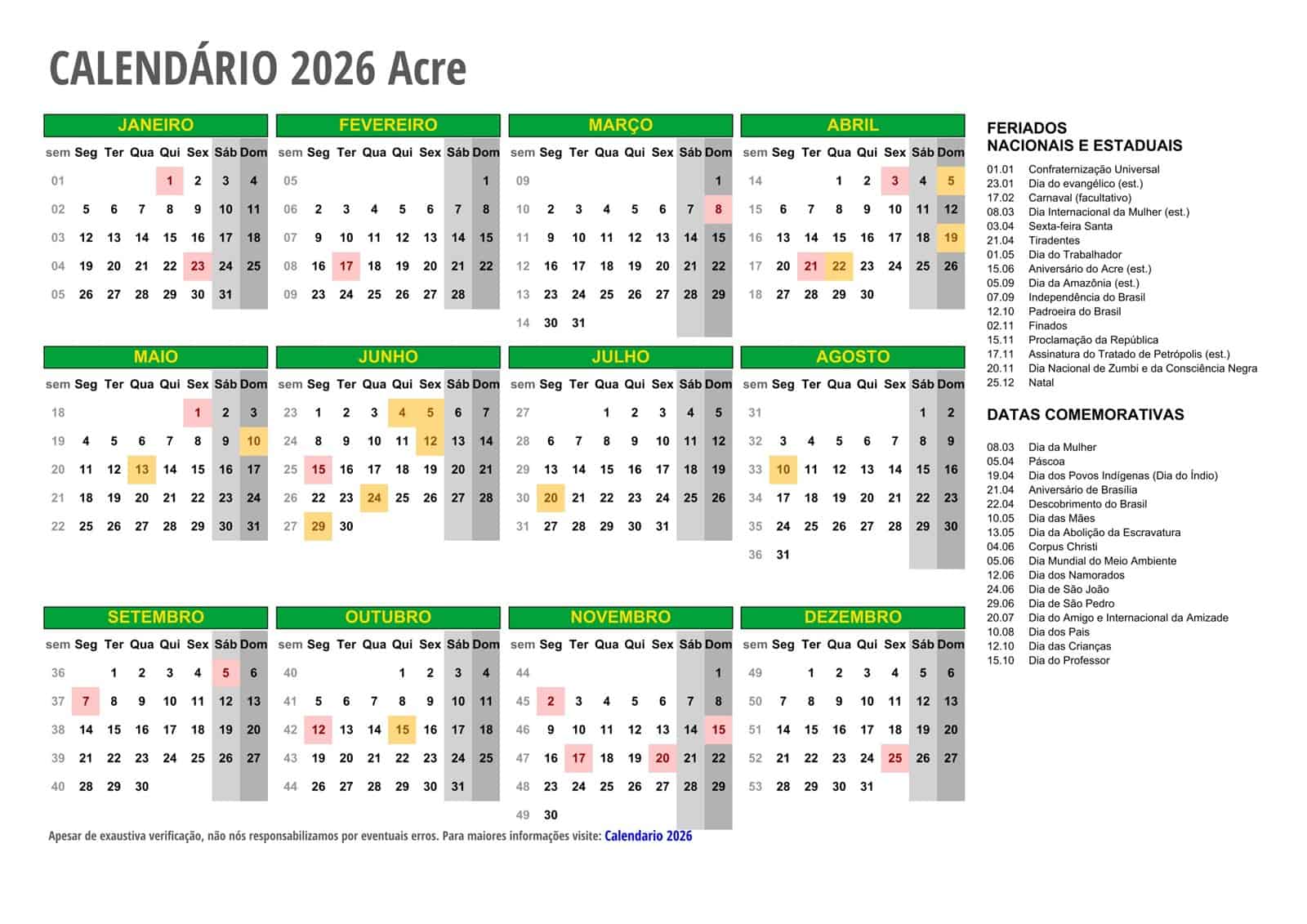 O governo do Estado do Acre divulgou nesta segunda-feira, 22, por meio do Decreto nº 11.809, publicado na edição extra do Diário Oficial do Estado (DOE), o calendário oficial de feriados e pontos facultativos para o ano de 2026. O documento regula o funcionamento dos órgãos e entidades do Poder Executivo estadual, com exceção dos serviços considerados essenciais.