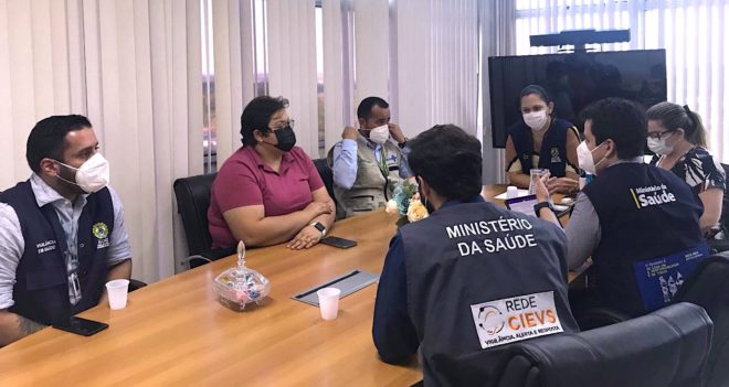 Técnicos da Secretaria de Estado de Saúde do Acre com a equipe do Ministério da Saúde em reunião na sede da pasta; profissionais se deslocaram para Plácido de Castro Foto: Taís Nascimento/Ascom