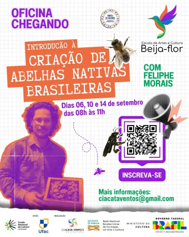 Entre os destaques está a oficina Introdução à Criação de Abelhas Nativas Brasileiras, ministrada por Feliphe Morais nos dias 06, 10 e 14 de setembro, das 8h às 11h, na Universidade Federal do Acre (UFAC). A atividade busca valorizar a preservação ambiental e conscientizar sobre o papel das abelhas como guardiãs da vida e do equilíbrio ecológico.