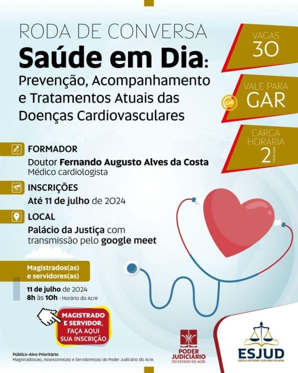 “Saúde em Dia: Prevenção, Acompanhamento e Tratamentos Atuais das Doenças Cardiovasculares”. Esse é o tema da roda de conversa que a Escola do Poder Judiciário do Acre (Esjud) promove nesta semana. A atividade acontece na quinta-feira (11) e sexta-feira (12), para magistradas(os), servidoras(es) e assessoras(es) da Justiça Estadual.