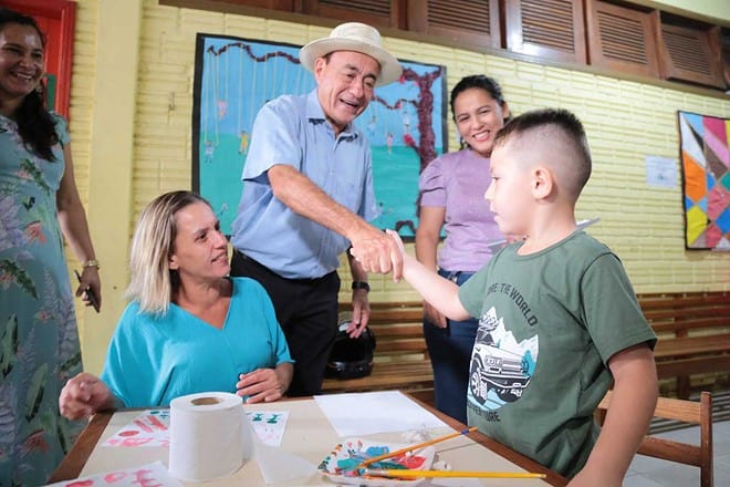 O prefeito de Rio Branco foi até a escola para conhecer as crianças talentosas, interagiu com toda a família, viu a exposição das artes e até ganhou um quatro da escola pintado pelos alunos.