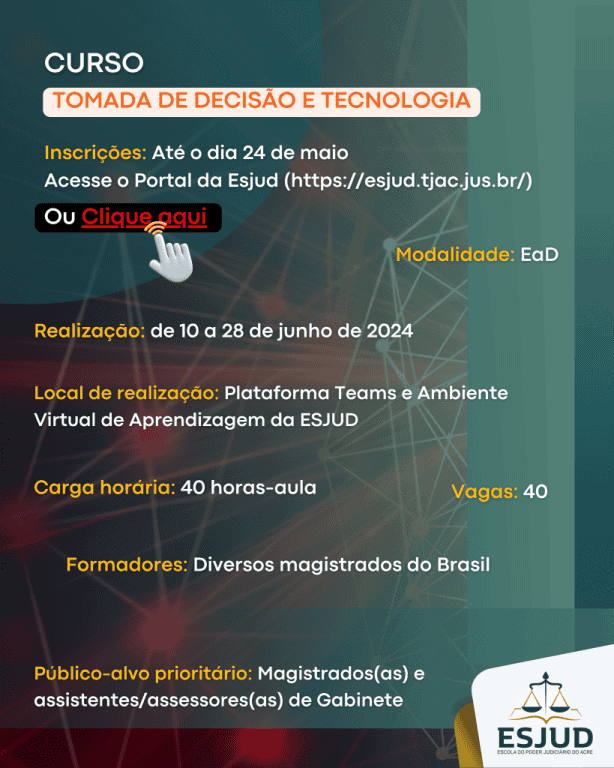A Escola do Poder Judiciário do Acre (Esjud) abriu as inscrições para o curso “Tomada de Decisão e Tecnologia”. O prazo segue até o dia 24 deste mês de maio, basta acessar o Portal da Escola (https://esjud.tjac.jus.br/), em seguida Calendário de Inscrição ou clicar aqui.