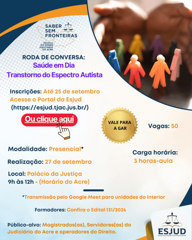 Acolher adequadamente pessoas autistas no âmbito da Justiça Estadual. Com esse objetivo, a Escola do Poder Judiciário do Acre (Esjud) promove neste mês de setembro a Roda de Conversas: “Saúde em Dia – Transtorno do Espectro Autista”. A atividade integra o Programa Saber Sem Fronteiras, idealizado e executado pelo Órgão de Ensino.