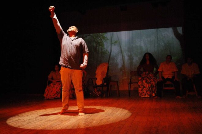 “Lá no seringal…” é a expressão máxima que rememora um passado comum a todo acreano. As pessoas que usam essa expressão são avós, pais, mães, tias, que foram seringueiros ou viveram em moradias simples, feitas de paxiúba, no coração da floresta amazônica. No presente, estas histórias são contadas para as gerações mais novas e são a matéria prima do espetáculo “Vozes do Seringal”, do Coletivo Taboqueiro, apresentado na noite da última quarta-feira, 19, no Teatro de Arena do Sesc, em Rio Branco.
