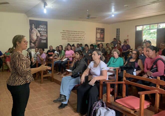 Com o propósito de apresentar as políticas e ações socioambientais desenvolvidas no estado, a coordenadora-geral do Programa REM Acre – Fase II, Roseneide Sena, participou na manhã desta quinta-feira, 27, do Fórum de Desenvolvimento das Mulheres do Alto Acre, realizado no auditório do Sindicato dos Trabalhadores e Trabalhadoras Rurais de Xapuri.
