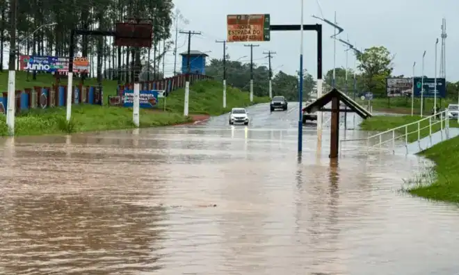 Imagens captadas pela reportagem mostram a via completamente tomada pela água nas proximidades da Igreja Batista do Bosque (IBB) e da Havan, área que costuma registrar transtornos recorrentes durante períodos de chuva intensa, dificultando a passagem de veículos.