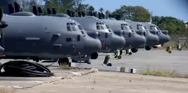 Aviões de transporte C-130J Super Hercules foram vistos taxiando e decolando do Aeroporto Rafael Hernandez, em Agudallia, Porto Rico.