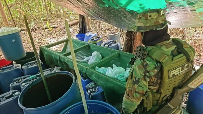 De acordo com o relatório da Força Especial de Combate ao Narcotráfico (Felcn), os agentes encontraram e incineraram grandes quantidades de insumos: 2.000 litros de acetato, 200 litros de gasolina, 50 quilos de carvão ativado, 50 quilos de bissulfito, 40 litros de ácido e 50 quilos de permanganato.