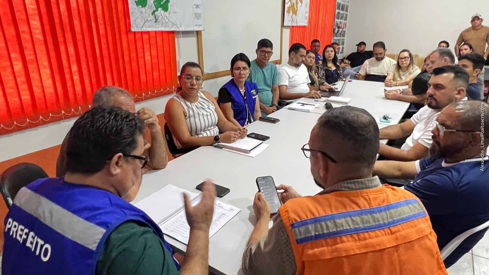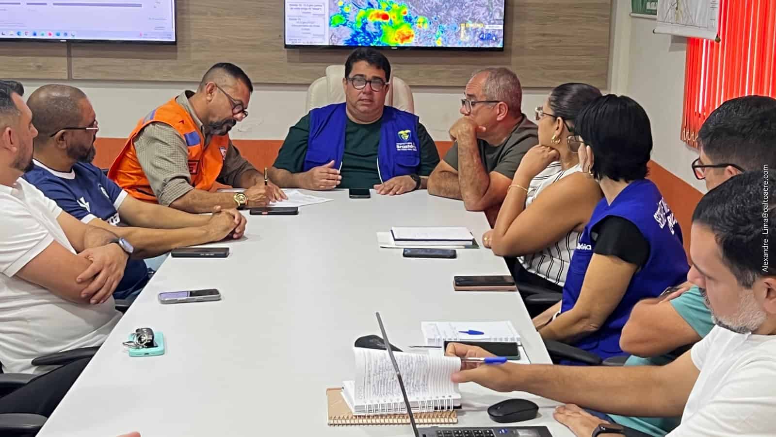 A Prefeitura de Brasiléia realizou, nesta semana, uma reunião emergencial na Sala de Situação da Defesa Civil para discutir e alinhar ações diante da elevação do nível do Rio Acre. O encontro foi conduzido pelo prefeito Carlinhos do Pelado (PP) e contou com a presença de secretários municipais, representantes da Defesa Civil e demais órgãos envolvidos no plano de contingência.