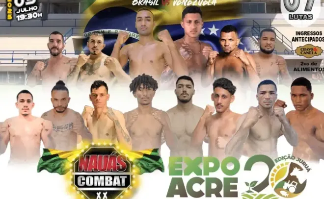 A Expoacre Juruá 2025, em Cruzeiro do Sul, contará com sete lutas de MMA e boxe no dia 3 de julho, incluindo uma disputa internacional. O venezuelano Joseph Romero e o cruzeirense Deusmar Junior vão se enfrentar na luta principal da noite no octógono do Nauás Combat XX, organizado por Márcio Dana White.