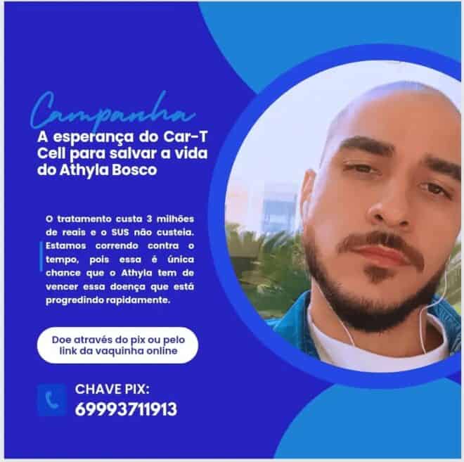 A família do jovem Athyla Bosco, de 26 anos, que há dois anos luta contra um linfoma não hodgkin difuso de grandes células B em estágio avançado, está pedindo ajuda para ter acesso a um tratamento que pode salvar sua vida.