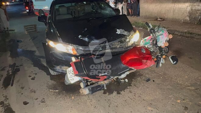 O motociclista Juvenil Gomes Leite, de 49 anos, sua esposa Michelle e uma criança de 8 anos ficaram gravemente feridos após um acidente de trânsito ocorrido na noite deste sábado (21), no cruzamento da Rua Fonte Nova com a Rua Padre Cícero, no bairro Conquista, em Rio Branco.