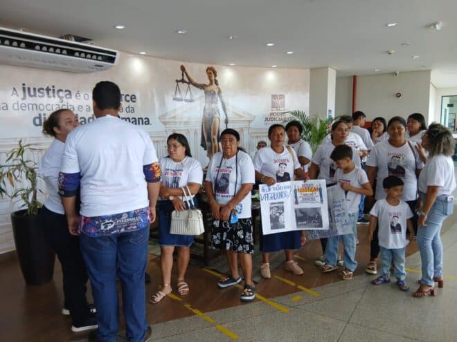 Familiares compareceram ao julgamento com camisas, faixas e cartazes, reforçando o pedido por justiça.
