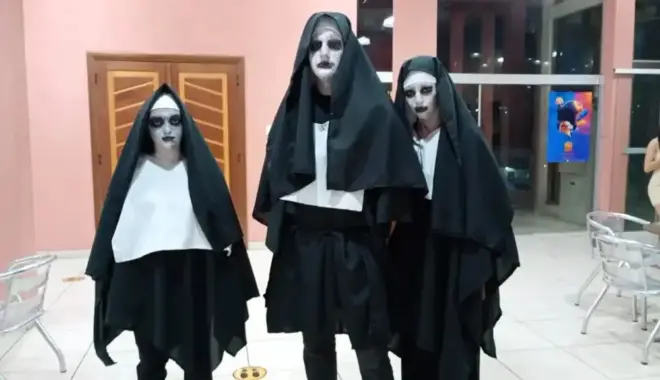 Três fãs roubaram a cena na noite de domingo (7) no Cine Romeu, em Cruzeiro do Sul, ao aparecerem fantasiados de freira para assistir à estreia de “Invocação do Mal 4: O Último Ritual”. O grupo chamou a atenção do público que aguardava a sessão e ajudou a criar um clima ainda mais imersivo para o terror.