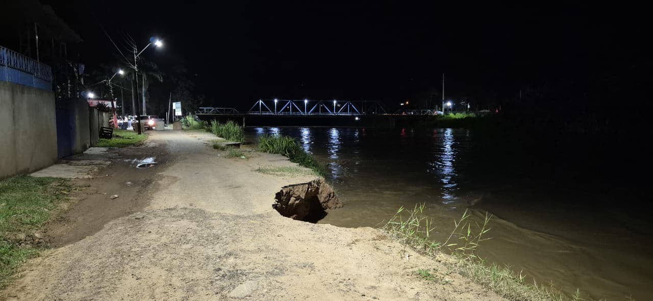 De acordo com a Defesa Civil, o desbarrancamento foi causado pela força da água do rio, que permanece acima da cota de alerta.