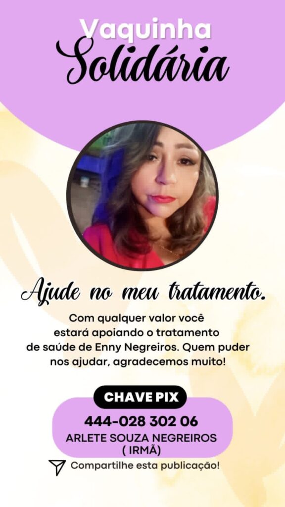 Familiares e amigos de Enny Negreiros iniciaram uma vaquinha online para custear despesas médicas de seu tratamento de saúde. A meta é arrecadar R$ 2.500, e os organizadores reforçam que qualquer valor é bem-vindo e pode contribuir para sua recuperação.