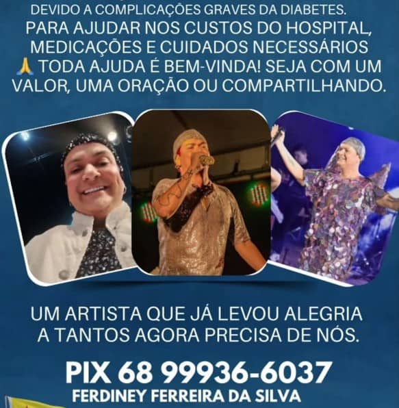 O cantor e compositor acreano Ferdiney Ryos, figura querida e respeitada no cenário musical do estado, atravessa um dos momentos mais difíceis de sua vida. Internado em um hospital de Rio Branco, o artista enfrenta complicações severas causadas pela diabetes, que afetaram gravemente sua saúde e o levaram a uma situação delicada e comovente.