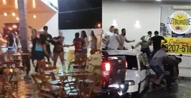 Parte da confusão foi gravada por presentes e divulgada nas redes sociais. A briga começou ainda no interior do bar e, se estendeu pelo estacionamento.