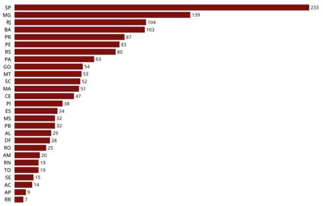 São Paulo (1.774), Minas Gerais (1.641) e Rio Grande do Sul (1.019) lideram as estatísticas. Roraima (7), Amapá (9) e Acre (14), registraram os menores números.