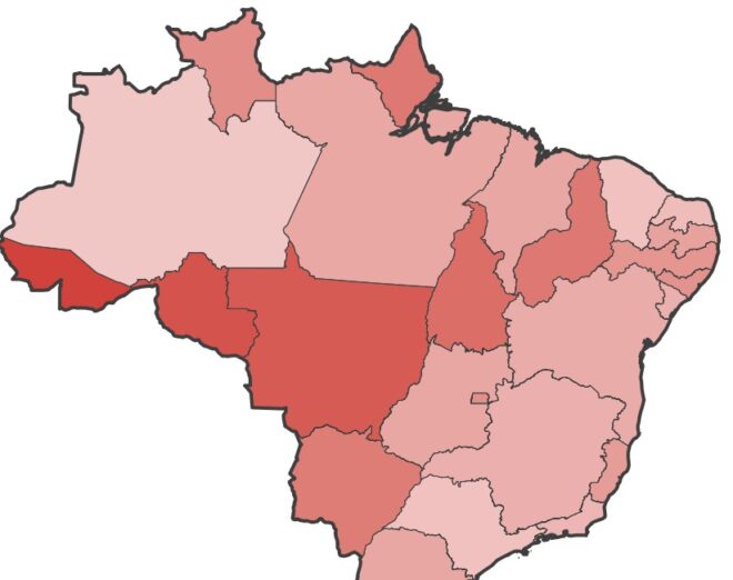 Em relação à taxa de mortes por 100 mil habitantes, Acre (1,58), Rondônia (1,43) e mato Grosso (1,36) têm os maiores números. Já Amazonas (0,46,), Ceará e São Paulo (ambos com 0,51) apresentam as menores taxas.