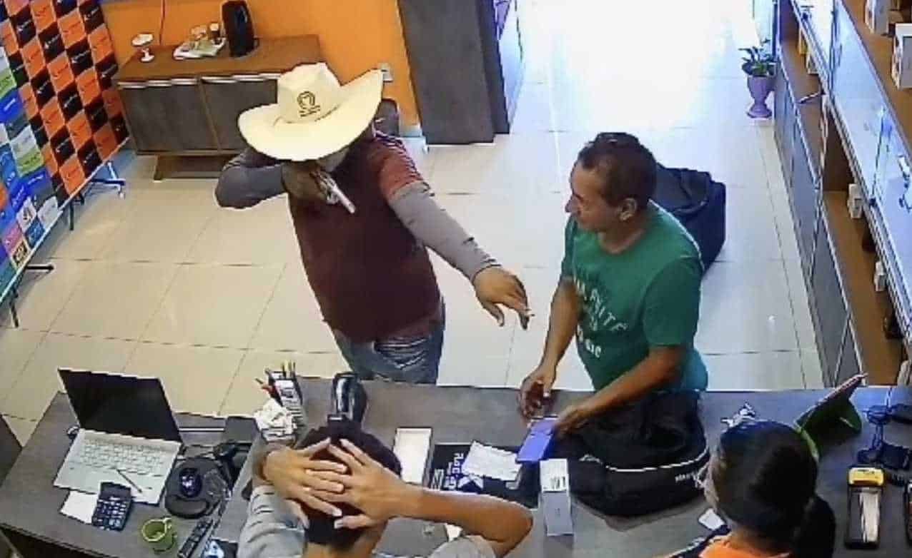 Nas imagens, é possível dar para ver o exato momento da ação criminosa. Os dois bandidos chegam na loja que revende acessórios e aparelhos celulares, se passando por clientes. Mas, logo depois anunciam o assalto.