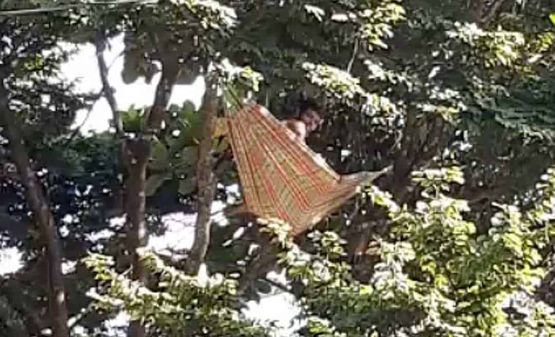 Um homem armou uma rede no alto de uma árvore na pracinha do São Francisco, em Rio Branco. Um motorista que ia passando pelo local flagrou e registrou em vídeo o homem na rede, que parece estar pouco incomodado com a altura e as pessoas que passam pela movimentada via.