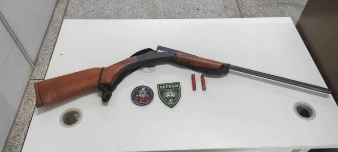Guarnições do Grupo de Intervenção Rápida Ostensiva (GIRO), do 5° Batalhão de Polícia Militar (5° BPM) e do Grupo Especial de Fronteiras (GEFRON), apreenderam uma arma de fogo, em Epitaciolândia. Um homem, de 47 anos, que estava na posse da espingarda, foi preso.