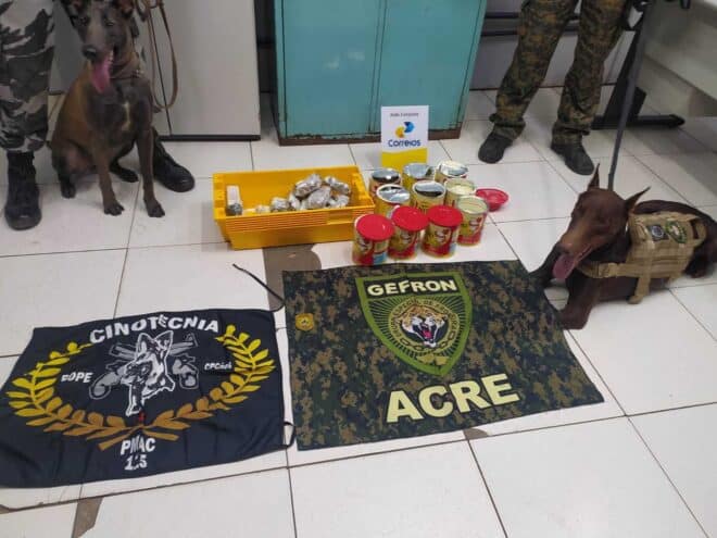 Durante operação de rotina das Forças Policiais os Cães Farejadores “Saori” da PMAC e “Colt” do Gefron acusaram uma encomenda vinda de Epitaciolândia com destino a São Paulo.
