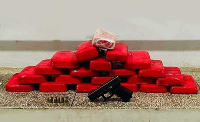 Durante as buscas no citado saco, os policiais encontraram 21 quilos de drogas, sendo 17 quilos 450 gramas de cloridrato de cocaína e 3 quilos 780 gramas de maconha, além de uma pistola Glock com 11 munições. Os três homens foram conduzidos a Delegacia de Cruzeiro do Sul.