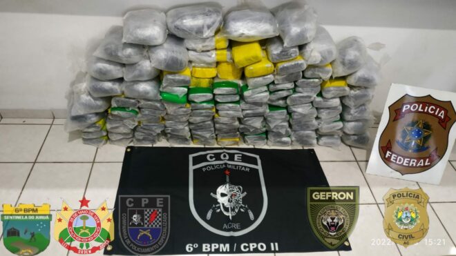 Durante a operação Guardiões da Fronteira, a Companhia de Policiamento Especializado (CPE) do 6° Batalhão da Polícia Militar do Acre (PMAC), juntamente com a Polícia Civil, Polícia Federal e o Grupo Especial de Fronteiras (GEFRON), apreendeu 118,5 quilos de entorpecentes em uma embarcação que navegava o rio Juruá, à altura do município de Rodrigues Alves.