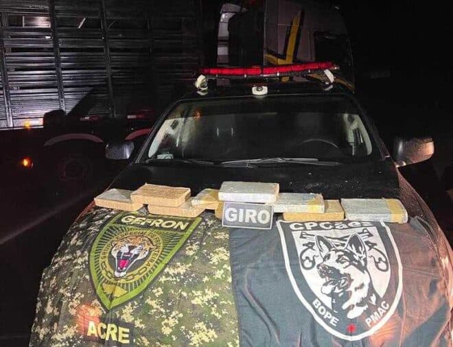 A Secretaria de Estado de Justiça e Segurança Pública do Acre (Sejusp) por meio do Grupo Especial de Operações de Fronteira (Gefron), em uma ação integrada com a equipe do Batalhão de Operações Policiais Especiais (Bope) – CPCÃES, Grupo Intervenção Rápida Ostensiva (Giro) – Polícia Militar, realizaram na noite de ontem, 22, a abordagem a um caminhão boiadeiro, no Trevo de Senador Guiomard, onde foi encontrada uma arma de fogo, munições e mais de 9kg de cocaína.