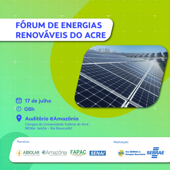 No dia 17 de julho, o Sebrae no Acre realiza o 1° Fórum de Energias Renováveis do Acre. O evento, idealizado junto ao Polo Sebrae de Energias Renováveis do Rio Grande do Norte, acontece no auditório do eAmazônia, localizado no campus da Universidade Federal do Acre (Ufac). O encontro tem como principal objetivo, discutir estratégias, ações e alinhar os investimentos que serão destinados ao setor.