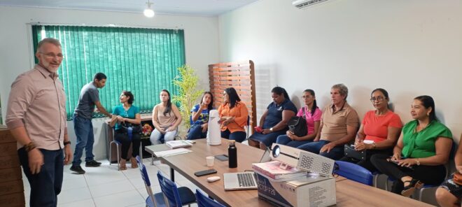 A capacitação foi realizada pelo consultor regional do programa, Estácio Guimarães, para 14 conselheiros na Secretaria de Educação Municipal.