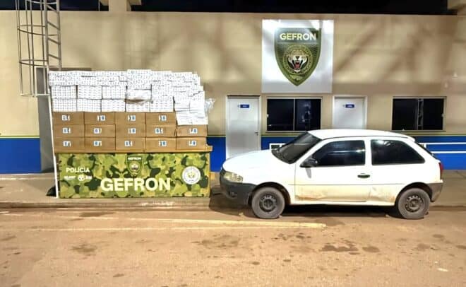 Durante a Operação PROTETOR das Fronteiras e Divisas, o Grupo Especial de Operações em Fronteira (GEFRON), vinculado à Secretaria de Justiça e Segurança Pública (SEJUSP), interceptou um veículo na BR-364, em Senador Guiomard, na tarde desta quinta-feira (27). O carro, que seguia de Plácido de Castro com destino a Rio Branco, transportava 12.500 maços de cigarros da marca PONT, provenientes da Bolívia.