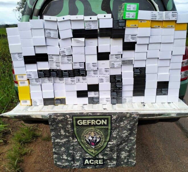 Foi quando visualizaram uma carga contendo dentro, vários modelos de celulares totalizando 166 unidades, todos lacrados que teriam como destino final, a capital do Acre, onde seriam comercializados.
