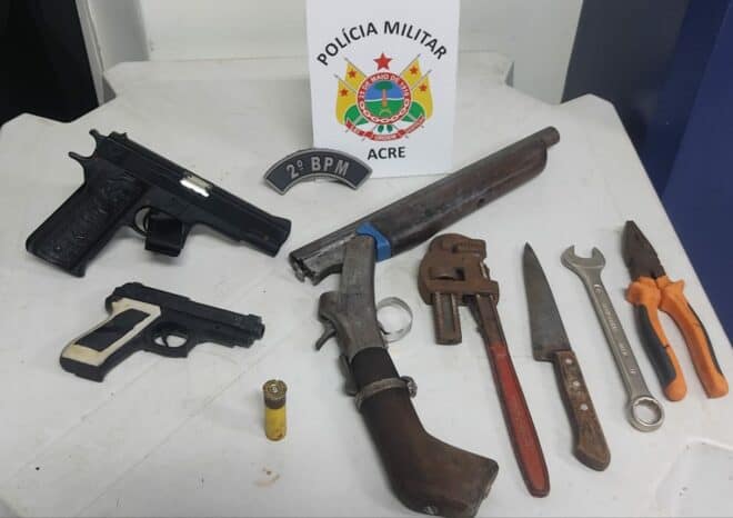 Foi quando os policiais descobriram o motivo da tentativa de fuga. o detido estava portando armas de fogo, sendo uma escopeta municiada e dois simulacros (pistolas de plástico), além de ferramentas utilizadas para arrombamentos.