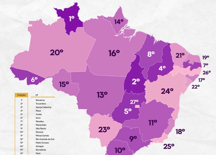 De acordo com o levantamento, o estado fica atrás apenas de Roraima, Tocantins, Santa Catarina, Piauí e Goiás