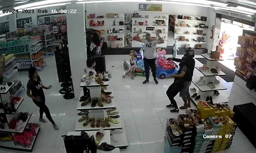 No vídeo é possível ver os assaltantes renderem uma cliente e duas vendedoras e sendo agressivos com uma das funcionárias da loja, que é mantida presa pelo pescoço pelo criminoso.