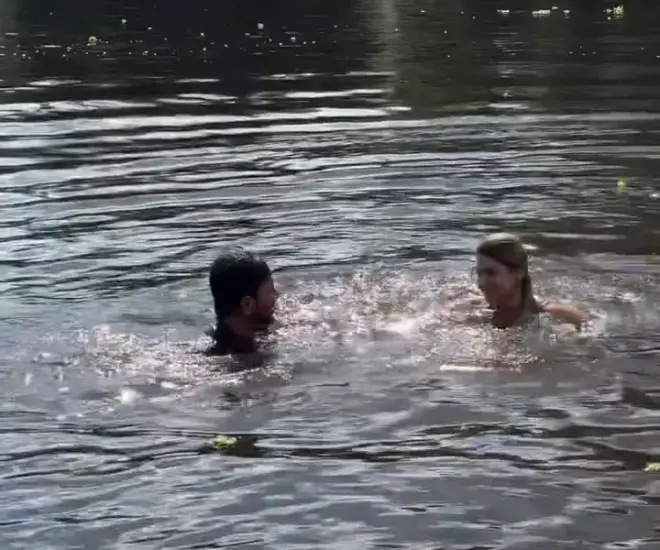 Nas imagens, Gladson e Karol aparecem de mãos dadas, enquanto pulam juntos nas águas do rio, em um clima de diversão e intimidade.
