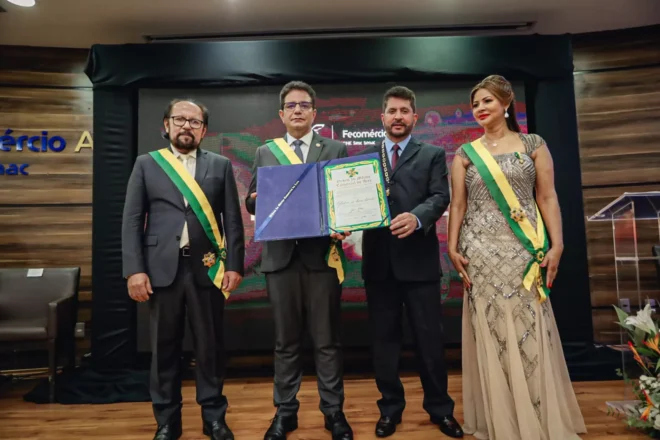 O governador do Estado, Gladson Cameli, recebeu na noite desta terça-feira, 18, em Rio Branco, a Ordem do Mérito Comercial – grau Grã-Cruz, concedida pela Federação do Comércio de Bens, Serviços e Turismo do Acre (Fecomércio-AC), que em 2023 celebra 33 anos de criação.