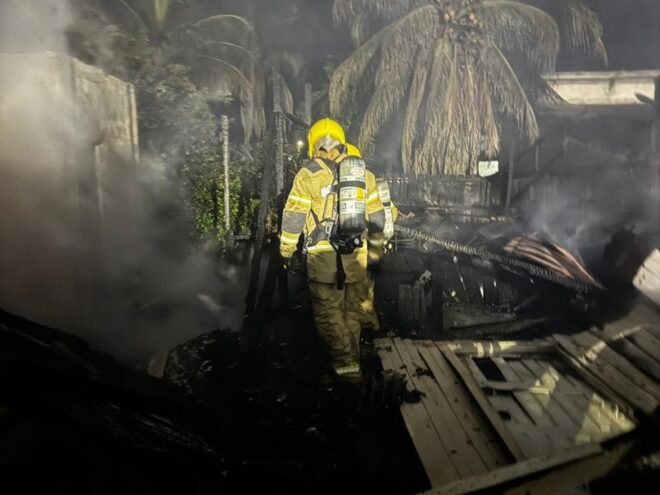 Um incêndio de grandes proporções destruiu uma casa e atingiu parcialmente outras duas na Travessa Santa Bárbara, no bairro Wanderley Dantas, em Rio Branco, na noite desta sexta-feira (16). O Corpo de Bombeiros confirmou que não houve feridos. A casa completamente consumida pelas chamas estava trancada e desocupada no momento do incidente.