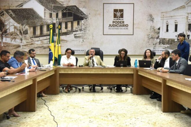O Grupo de Monitoramento e Fiscalização do Sistema Carcerário (GMF) do Tribunal de Justiça do Acre (TJAC) realizou, nesta segunda-feira, 29, na sala de reuniões do Palácio da Justiça, a terceira reunião do Comitê de Políticas Penais, uma mobilização para contribuição da construção do Plano Nacional Pena Justa em cumprimento à Arguição de Descumprimento de Preceito Fundamental (ADPF) 347.