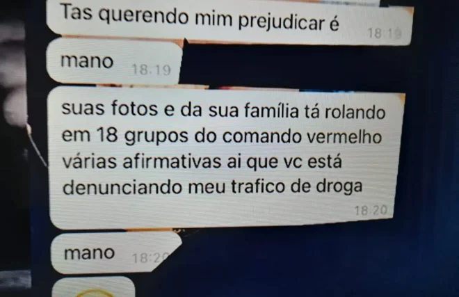U. recado dado a um comerciante da Baixada do Sobral o suspeito se identifica com um dos líderes do Comando Vermelho no Estado do Acre. Ele explica que uma pessoa havia publicado a foto do comerciante em 18 grupos da facção informando que o mesmo estaria negociando com a polícia um certo ponto de venda de drogas da organização: “será que teremos que tomar uma decisão drástica para calar sua boca? Me liga”, diz a mensagem. Segundo a polícia, se a vítima escolhida ligar de volta, vai ser extorquida.