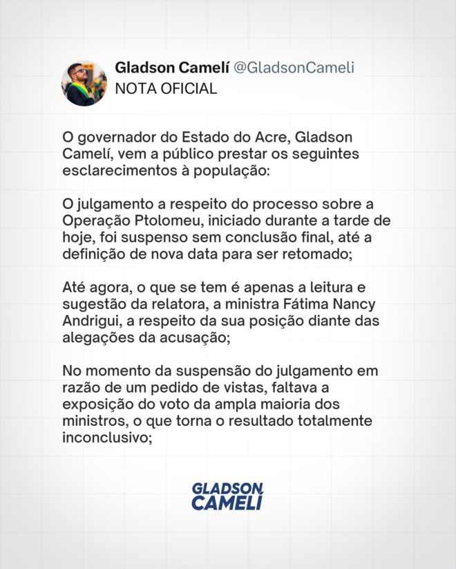 O governador do Acre, Gladson Cameli (PP), divulgou nota oficial nesta quarta-feira (17) reforçando que o julgamento do processo relacionado à Operação Ptolomeu no Superior Tribunal de Justiça (STJ) foi suspenso e ainda não tem conclusão. A sessão, iniciada na tarde desta terça, foi interrompida após pedido de vista e deverá ser retomada em nova data a ser definida pelo tribunal.