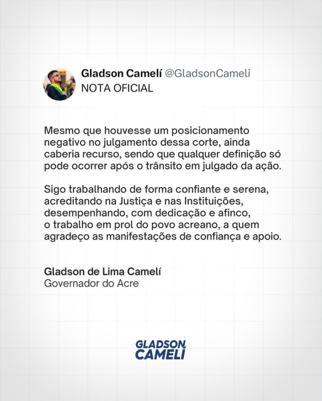 A nota ressalta que, mesmo na hipótese de um eventual resultado desfavorável, a legislação garante o direito a recursos, e qualquer efeito prático só ocorreria após o trânsito em julgado da ação. O governador afirmou seguir exercendo normalmente suas funções, mantendo-se “confiante e sereno”, e reafirmou sua “confiança na Justiça e nas instituições”. Ele também agradeceu as manifestações de apoio recebidas.